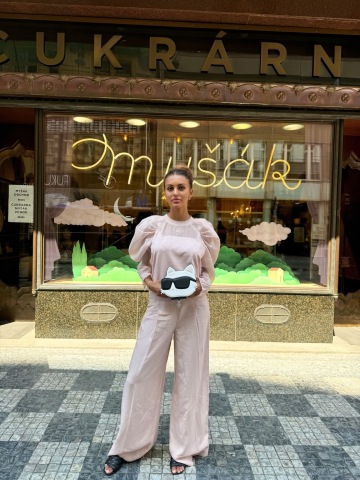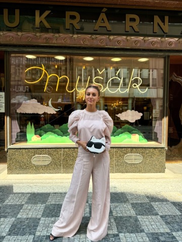A jak jsme slíbili, nakonec pro vás máme naprosto sladký outfit, který je jako dělaný na váš víkendový brunch nebo i procházku do cukrárny na oblíbenou zmrzlinu. Kombinace pudrově růžové, volánků a kočičí kabelky vytvoří roztomilý look. Na tyto barvy u Carly běžně zvyklí nejsme, ale jistě se shodneme, že jí rozhodně svědčí. Komplet složený z lněných kalhot a topu s poloprůsvitnými rukávy je skvělou volbou na přechodné dny, kdy je teplo, ale již není 35 stupňů. Udržuje příjemnou tělesnou teplotu a když je třeba, profukuje a větrá. Doplňte vše příjemnými pantoflíčky a můžete vyrazit!