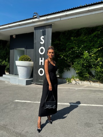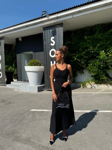 Zde se nedá říci nic jiného, než že se Carly proměnila v dokonalou dámu, která má klasickou eleganci v malíčku. Ale i tak do ní dostala mladistvost. Černé úplné šaty tvořící skvělou siluetu vynesete hned na několik způsobů. Když ne na romantickou večeři, tak například na společenskou událost. Opět bude akorát záležet na tom, jakými doplňky outfit doladíte. Zde se zvolila třpytivá kabelka sladěna s lodičkami, které mají stejně třpytivý nápis KARL. Díky tomu, že jsou tyto kousky výrazné, Carly zvolila uhlazený účes a žádné výrazné šperky, díky kterým by to mohlo působit již trochu moc.