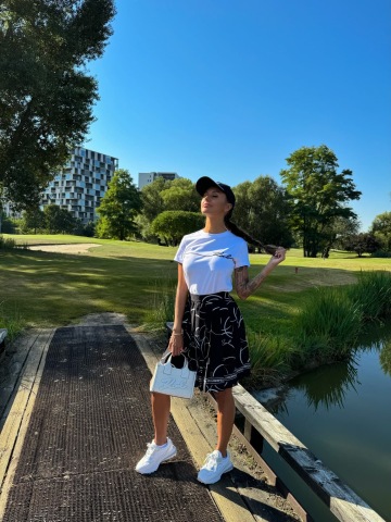 Outfit, který je praktický, pohodlný a navíc stylový a variabilní. Nejsou to ty nejlepší vlastnosti, které váš look může mít. Sukni zdobí výrazný potisk, který je jedním z nejvýraznějších aspektů celého outfitu. Pokud byste k ní tedy vybraly i výrazný a extravagantní vršek, nemusí to úplně klapnout. Ale s jednoduchým tričkem, které zdobí pouze jemný nápis KARL, se krásně doplňují a především vyvažují. Pro komfort Carly zvolila botasky, ve kterých vydržíte celý den. V rámci doplňků můžete zvolit větší tašku, do které se vám vejdou všechny potřebné náležitosti včetně notebooku, ale pokud vám to situace dovolí, tak také roztomilou menší kabelku do ruky, díky níž bude look vypadat více holčičí. No a v těchto slunečných dnech jistě sáhněte po slunečních brýlích nebo právě kiltovce, která může podpořit váš sportovně-elegantní look.