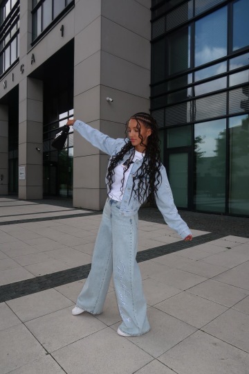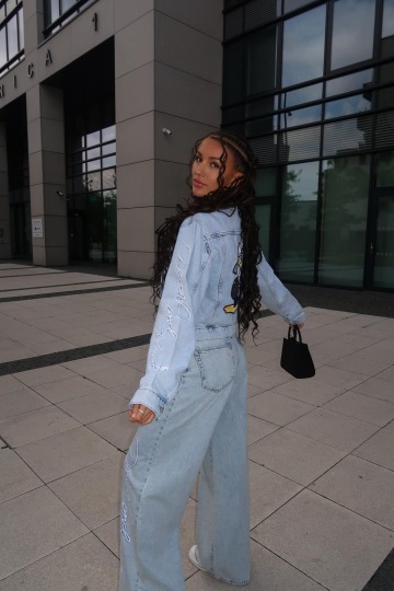Carly otevírá styling v ikonickém denimu – volné kalhoty s monogramem a oversize bundu kombinuje s bílým tričkem, kde se na scéně objevuje nečekaný hrdina: Donald Duck v podobě Karla Lagerfelda. Tohle spojení rebelujícího kačera a nekompromisního génia módy je geniální hříčkou, která dává klasice nový náboj.