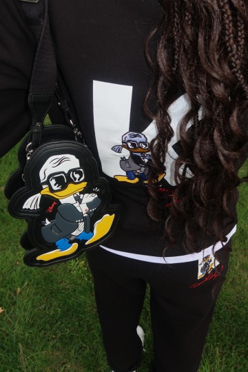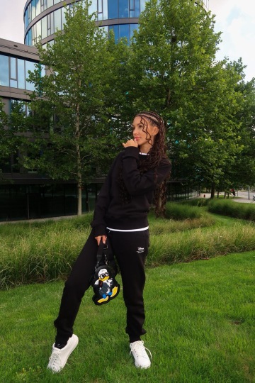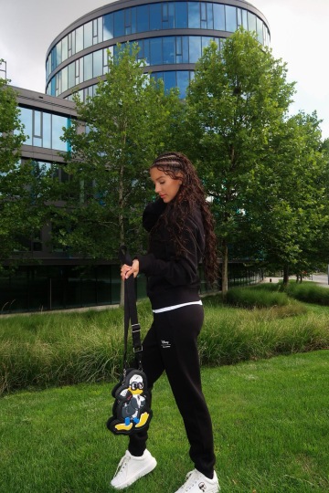 V dalším outfitu Carly přechází do minimalistické elegance. Černá mikina a tepláky s decentním logem dostávají úplně jiný rozměr díky doplňkům – kabelce ve tvaru kačera, která z obyčejného looku dělá sběratelský kousek. Je to přesně ta rovnováha, kterou by Karl ocenil: kombinace jednoduchosti, ironie a perfektního střihu.