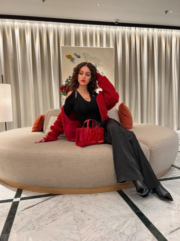 Zbytek outfitu šla Carly do černé, čímž vytvořila nestárnoucí klasiku, především v kombinaci s červenou rtěnkou. Ta fitu dodává dávku ženskosti a sex-appealu, který podtrhují také boty na podpatku. Výrazné kousky jako bunda, kabelka a boty na podpatku jsou doplněny pouze klasickými kalhotami širokého střihu a upnutým tričkem se zajímavým a sexy prostřihem.