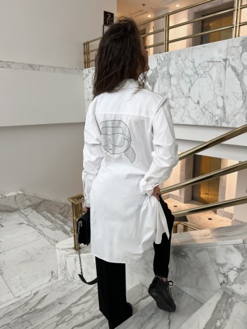 Následně se Carly pustila do outfitu, který může být velmi variabilní, ačkoli se to na první pohled nemusí zdát. Klasická bílá košile je základ značky KARL LAGERFELD a zde ji ještě podtrhuje hlava ikonické postavičky vytvořena z blýskavých kamínků, což ji dělá jedinečnou. Nosit ji můžete rozeplou přes crop top či tílko, ti odvážnější i přes krásnou podprsenku určenou pro oko okolí.