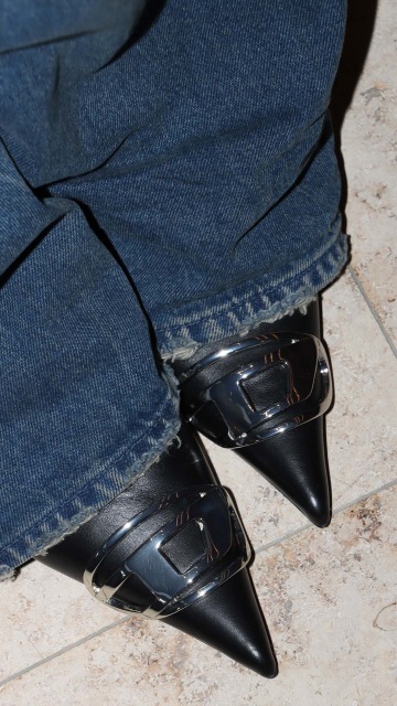 Celý look pak uzavírají pantofle Venus Kittie-B, jejichž lakovaný povrch a špičatá silueta fungují jako tečka, která dává smysl celé větě. Zrcadlí světlo, ale hlavně zrcadlí náladu: rozhodnost, klid a vědomí, že styl není o přehnané snaze, ale o zralosti vkusu.