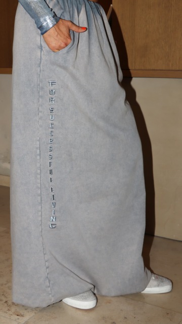 Sukně O-REIRA v odstínu cloud gray je klíčem k posunu celého looku do sofistikovanější roviny. Maxi délka, volný střih a jemné nařasení v pase vytvářejí siluetu, která je ženská, ale zároveň ležérní.