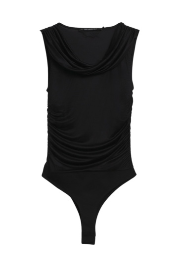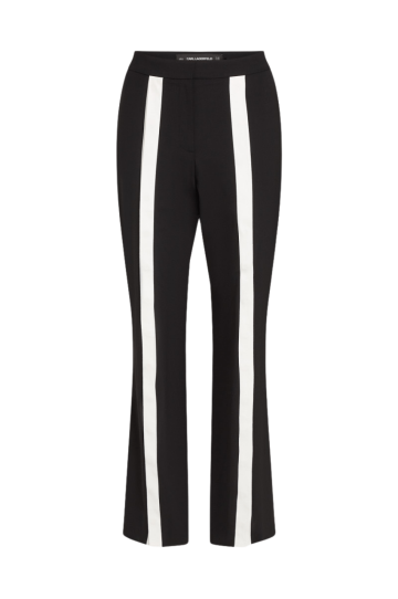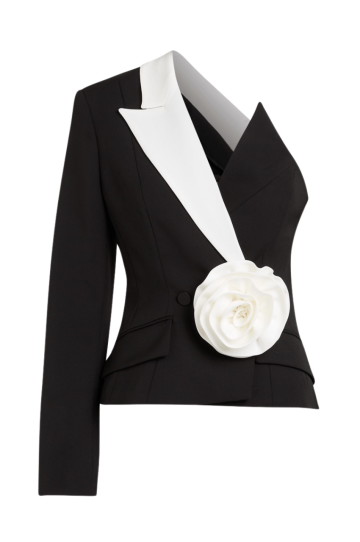 Pod blejzrem se skrývá rafinované body s květinovým motivem, které dodává outfitu jemně provokativní nádech. Květiny jsou grafické, téměř futuristické, žádný sentiment. Je to odkaz na Karla, jak ho známe: černobílý svět se špetkou dramatu. Body navíc přidává ženskost a energii, která balancuje jinak maskulinní střih saka a kalhot.