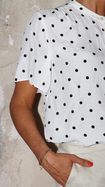 Kancelářská móda nemusí být jen vážná. Bílá halenka s jemným puntíkatým vzorem dodá outfitu hravost a ženskost, aniž by působila neprofesionálně. V kombinaci s lněnými kalhotami vznikne krásně svěží look.