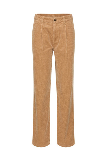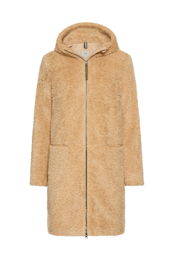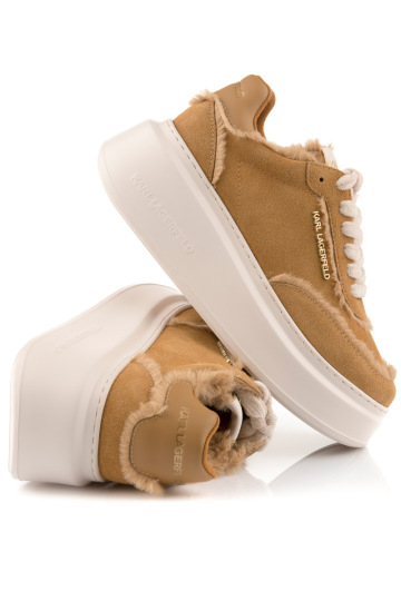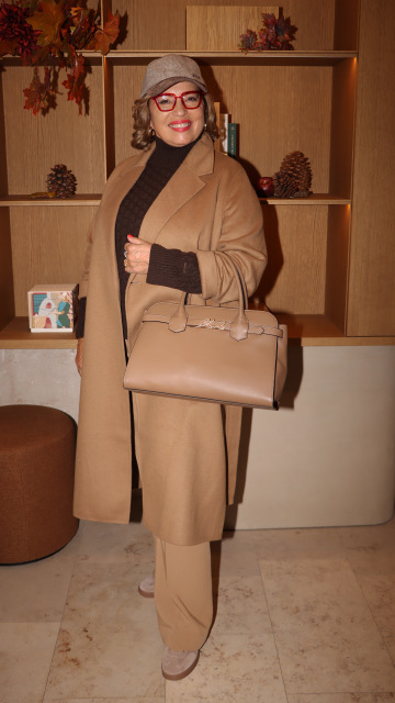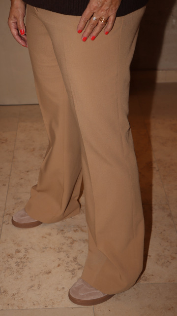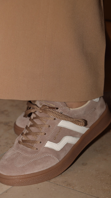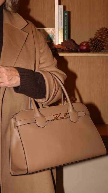 Základem je kabát v odstínu camel, doplněný o hnědý úpletový rolák a široké kalhoty v béžové - vše značky GANT. Celý look sjednocuje kožená kabelka KARL LAGERFELD s kovovým logem a semišové tenisky GANT, které dodávají pohodlí i městský charakter.