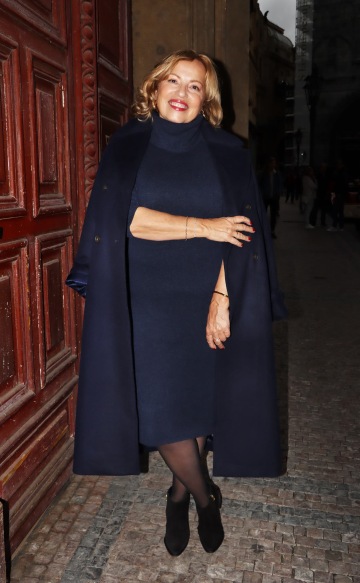 Ztělesnění nadčasové elegance v tmavě modrých šatech s rolákem, které působí stylově a zároveň pohodlně. Přes ramena má Janka nedbale přehozený kabát, který dodává outfitu sofistikovaný vrstvený vzhled.
