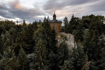 Broumovské stěny zdobí úžasná kaple Hvězda, která dostala název od svého půdorysu. Vydejte se na krátkou procházku po hraně skal a co chvilku na vás z lesa vykoukne nový skalní útvar. Na stejném vrcholu leží i turistická chata, takže můžete procházku zakončit obědem.