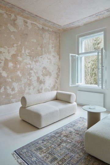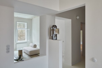 V obytných místnostech se soustředily na prosvětlení dispozice a otevřenost prostoru, takže například obě místnosti propojuje výdejní okénko, které bylo v takto velkorysých bytech často k vidění. „V ložnicích jsme zachovaly původní dřevěné podlahy a pouze je repasovali. Koupelně dominuje velkorysý sprchový kout nepravidelného tvaru, umyvadlo a WC,“ dodává Petra. Minimum materiálů a sjednocující design procházejí skrz celý prostor a podporují klidnou atmosféru bytu. Prostupující linkou je odhalená původní výmalba na stropech i stěnách, toto odkrytí vytváří nosné, výrazné a jemně zabarvené obrazy v každé z místností. Byt pak v poslední fázi vybavilo minimalistickým nábytkem designové studio Janský & Dunděra a firma Todus.