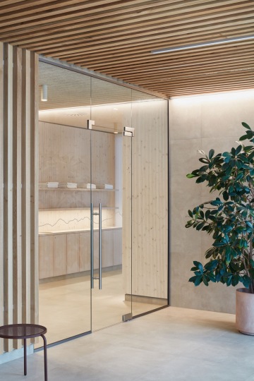 Vstupní hala vtahuje dovnitř do útrob budovy. Přes šatny se návštěvník dostává k prvním atrakcím v podobě páry a ochlazovacích bazénků. Druhé patro nabízí více využití, a to včetně několika odpočíváren s výhledem do zeleně. V budově jsou použity materiály odkazující k budově ze 70. let minulého století. „Pokračujeme tedy s lokálně umístěným drceným kamenem, světlou dlažbou a dřevěným obkladem, a to vše doplňují prvky z betonu u umyvadel nebo ledovačů,“ dodávají.