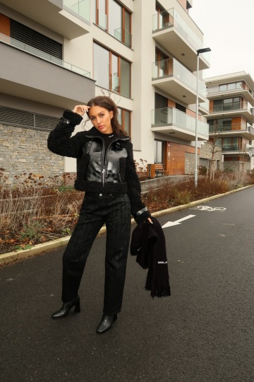 Hlavním kouskem je bunda, jejíž tělo je tvořeno z lesklého polyesteru připomínající vzhled kůže, ale rukávy z ovečkovsky kudrnaté à la kožešiny, opět ale umělého typu. Kousek, který by neměl chybět žádné obdivovatelce KARLa a stylu.