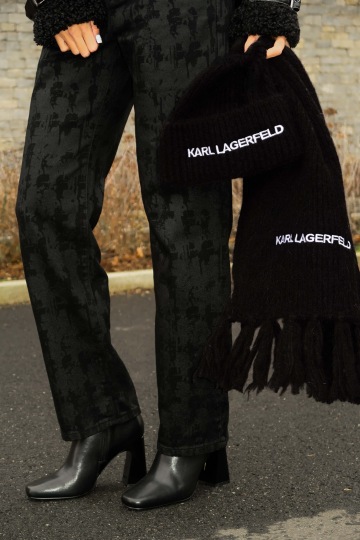 Doplnila k ní kalhoty, které jsou zajímavé potiskem hlav Karla. Motiv, který značka používá čím dál více a ideální varianta, jestliže nemáte rádi textová loga. Zde se jedná o tón v tónu, takže to nepůsobí agresivně a naopak udělají look zajímavým.