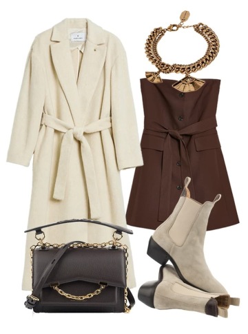 A nakoniec tu máme čerešničku na torte - dokonalý outfit na špeciálnu príležitosť, večeru alebo rande! Čokoládovo-smotanový look, ktorému málokto odolá. Šaty GANT v nádhernom hnedom odtieni, ktoré vám vďaka opasku v páse dodajú skvelú postavu. Doplňte ich eleganciu členkovými čižmami od rovnakej značky, ktoré udržia vaše nohy v teple a pohodlí, ale nízky podpätok im dodá ženský nádych. Všetko doplňte krémovým kabátom od talianskej značky Manuel Ritz, pretože kto vie eleganciu viac ako Taliani. A v takom kvalitnom prevedení a zo špičkového materiálu! A čo by to bolo za outfit bez správnych doplnkov! Tentoraz siahnite po čierno-zlatom, ktorý ladí s tónmi celého outfitu. Chybu tu neurobíte ani s kabelkou KARL LAGERFELD, do ktorej sa zmestí naozaj všetko, nenechajte sa oklamať jej veľkosťou! A vďaka hrubšiemu náramku nemusíte vymýšľať žiadne ďalšie šperky.