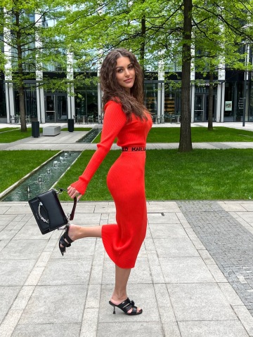 Ako druhý outfit Carly zvolila zlatú strednú cestu, kde sa opäť skĺbi elegancia a pohodlie, ale tentoraz je už trochu viac formálna. Šaty, ktoré vám vytvoria dokonalú postavu, a navyše sú v dych vyrážajúcej farbe, vám zaručia, že vás na ulici rozhodne nikto neprehliadne. Sú z rebrového úpletu, takže nič pohodlnejšieho a zároveň elegantného nájsť už nemôžete a dlhé rukávy vám zaručia ochranu pred chladnými ranami a večermi, keď budete chcieť pokračovať rovno na drink s priateľmi. Pretože tieto šaty sú ako stvorené na denné pochôdzky, vybavenie potrebného v kancelárii a následne zavŕšenie dňa pri poháriku niečoho dobrého v skvelej spoločnosti vašich blízkych.