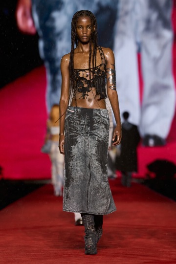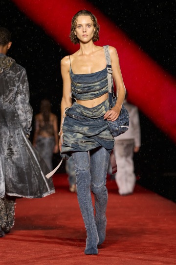Z prvej desiatky lookov je zrejmé, že sa Martnes rozhodol pre samotnú analógiu príbehu DIESELu. Takmer výhradne denimovými lookmi ako by nastavoval základný teoretický rámec. Denim is what we do. Ďalšia kapitola ale na seba nenechala dlho čakať. S postupujúcou gradáciou a silňujúcim dažďom reflektormi aj hudba viac a viac imituje efekt epickej búrky. Džínsovina sa na caste zdanlivo rozpadá. Fragmentáciu denimu Martens ťaží na maximum, až sa zdá, že pred našimi zrakmi pochodujú vojaci v kamufláži. V sugestívnom stylingu Ursiny Gysi (ktorá stojí za poslednou kampaňou Jacquemus) sa objavujú fascinujúce šperky na rukách. Pribúdajú aj ostrejšie a neónové farby. Títo matrixoví vojaci boli zrejme vyslaní do tropickej džungle mimo našej galaxie bojovať za pozemské techno. Tú a tam dokonca začne variaovať make-up. Striebristo biele a zlaté tváre pripomínajú neľudské entity inšpirované slávnou bondovkou Goldfinger.